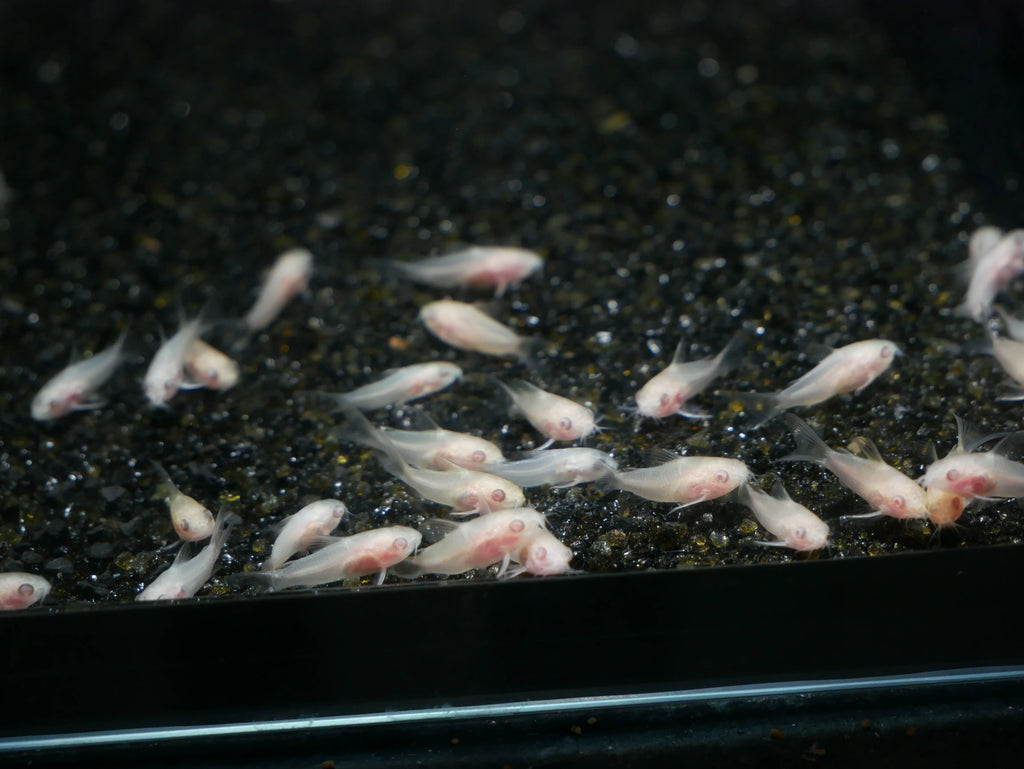Albino Pygmy Corydoras (Corydoras pygmaeus – Albino Variant) A rare and peaceful nano catfish with a beautiful pale pink-white body and bright red eyes