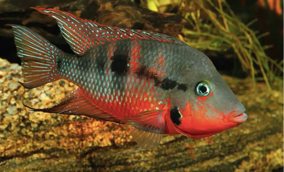 Firemouth Cichlid (Thorichthys meeki) A bold and beautiful Central American cichlid with a fiery red throat and confident personality