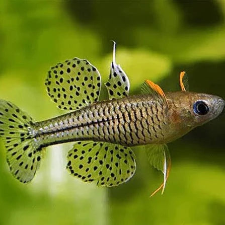 Gertrude’s Spotted Blue Eye Rainbowfish is a delicate and colorful nano fish, known for its translucent body, bright blue eyes, and beautifully spotted fins. This active and peaceful species thrives in well-planted aquariums with gentle water flow, making it a fantastic addition to community tanks with similarly sized tankmates.