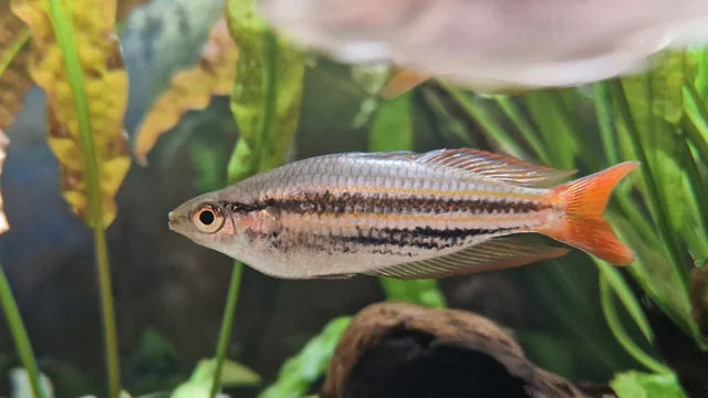 The McCulloch’s Rainbowfish is a stunning yet underrated species native to northern Australia. It displays a shimmering silver-blue body with soft gold highlights and faint horizontal striping that glows under good lighting. Peaceful and active, these rainbowfish thrive in planted aquariums with open swimming space and gentle water flow. When kept in groups, males develop more intense coloration and engage in dazzling courtship displays. Hardy and social, McCulloch’s Rainbows are an excellent choice for community tanks or Australian biotope setups.