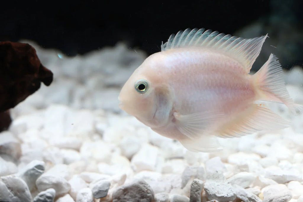 The Platinum Polar Parrot Cichlid is known for its brilliant platinum-white coloration, round parrot-like face, and compact size compared to standard parrot cichlids. Peaceful for a cichlid yet full of personality, it makes an excellent showpiece in community tanks with similarly sized fish. Hardy and adaptable, this fish thrives in well-structured aquariums with rocks, caves, and open swimming space.